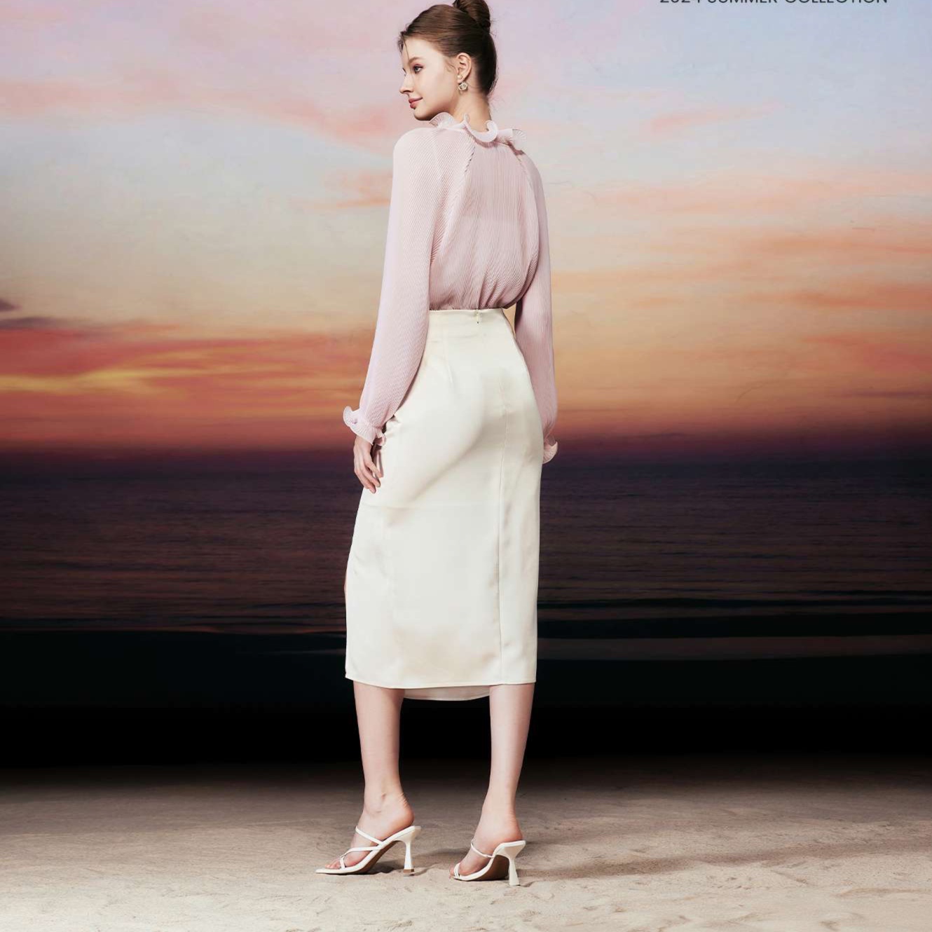 贅沢なプリーツ使いと、サイドのスリットが上品な雰囲気を演出。