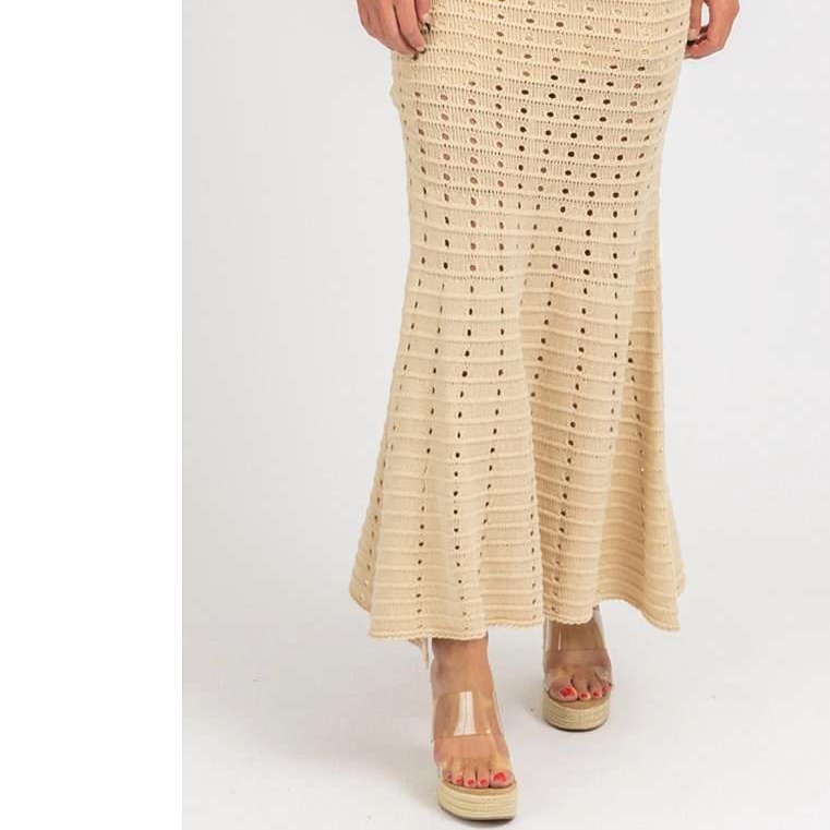 繊細なかぎ針編みの総柄デザインが魅力のマーメイドスカート。裾が広がるシルエットに加え、大胆なスリットが動きやすさを提供し、リゾートシーンでも映える一着。柔らかな素材が心地よい肌触りを実現し、エレガントな印象を与えます。大人の女性にぴったりなアイテムです。