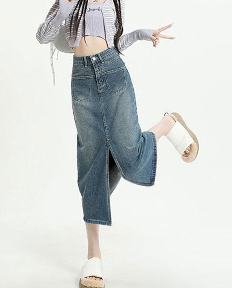 流行感抜群のミディ丈デニムスリットスカートが登場。