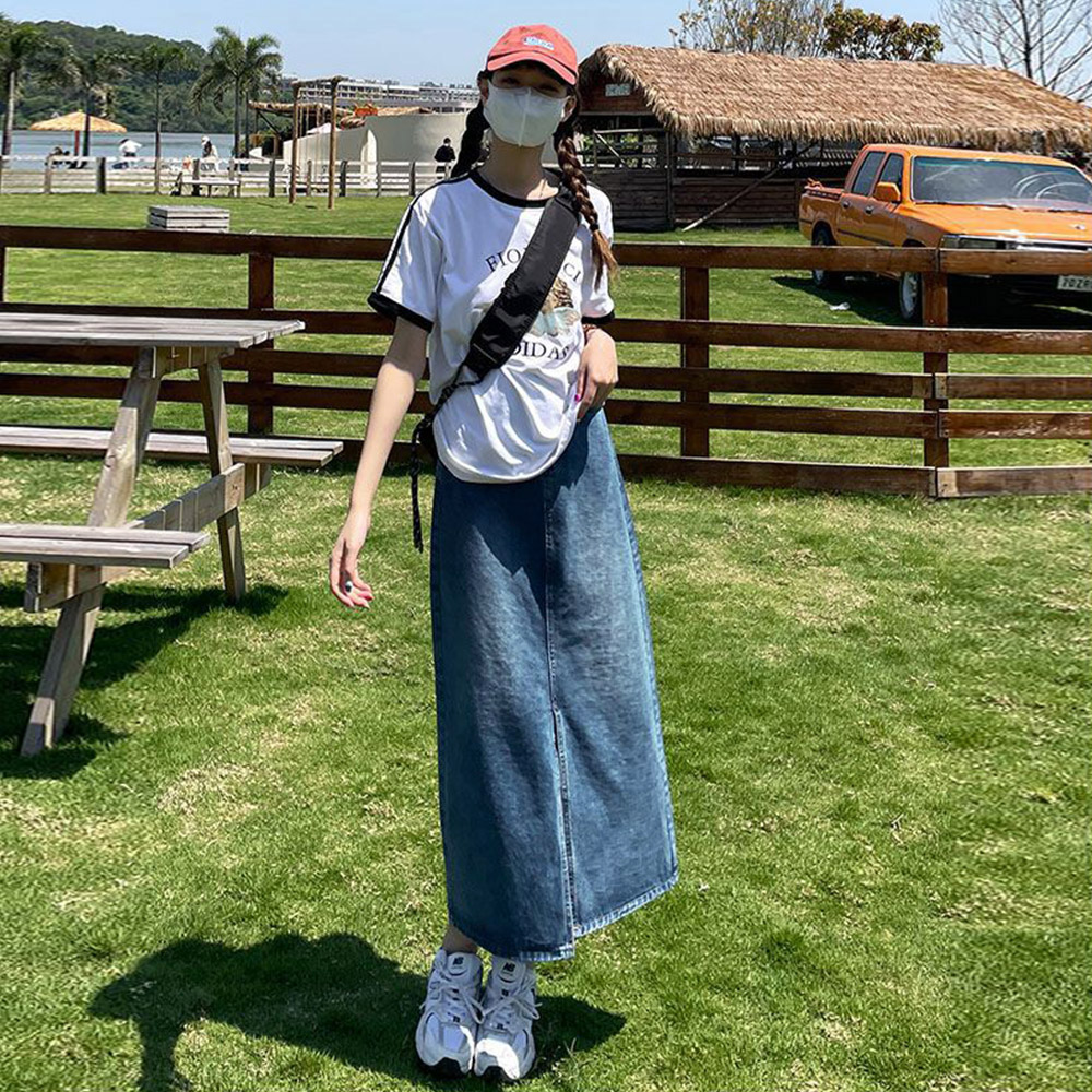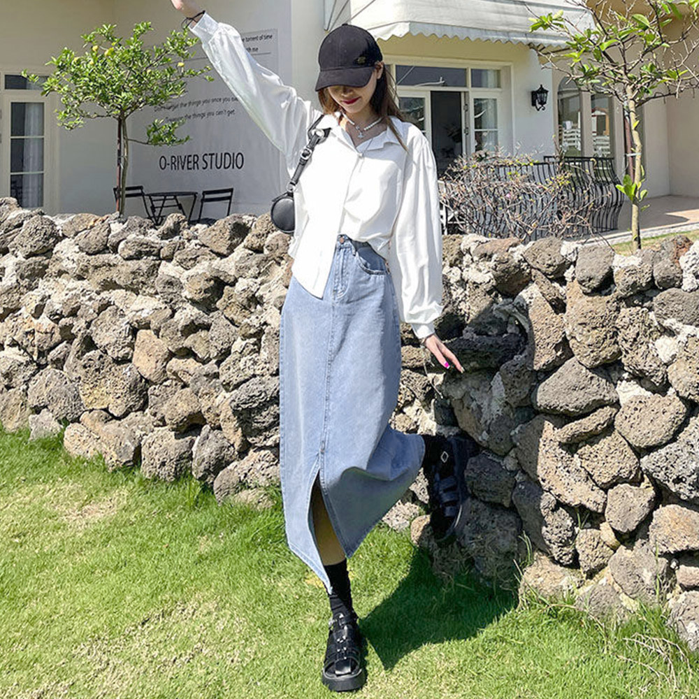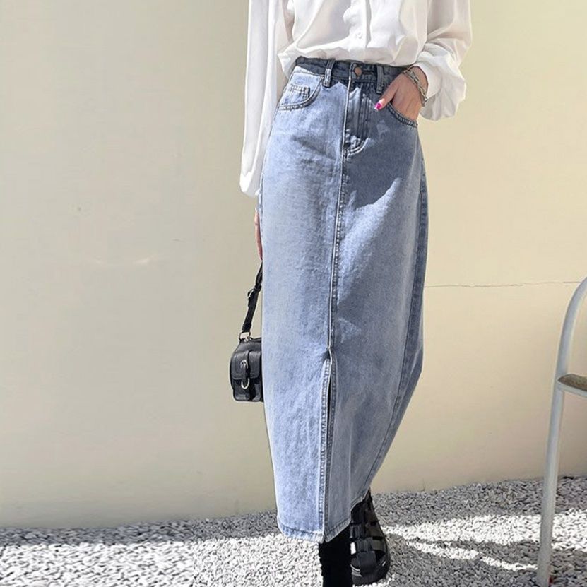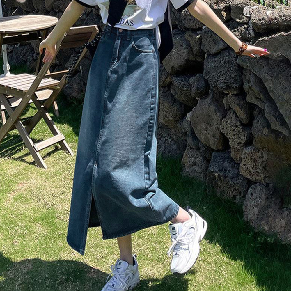 センタースリットで抜け感を演出しつつ歩きやすさも両立した、大人な印象を与えるタイトデニムスカート